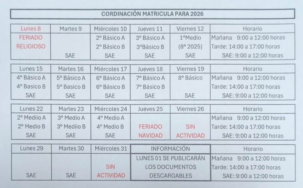 Estimada comunidad escolar del Colegio Amanecer de Coronel, en el marco de las matrículas para el año 2026, se adjunta el documento con las respectivas fechas y horarios para cada curso, señalar también que los días viernes por el proceso de matricula se atendera tanto en la jornada de mañana como en la de tarde.